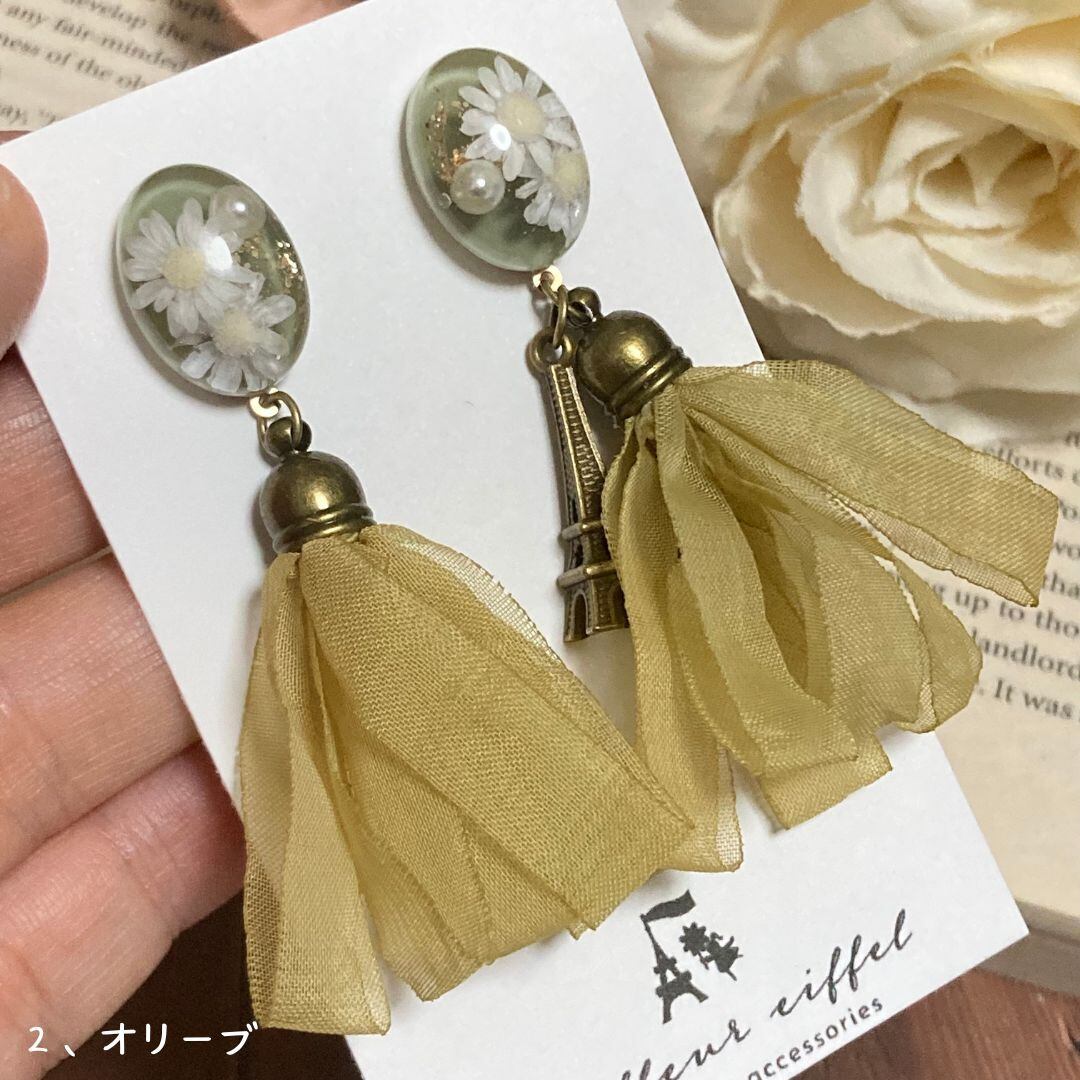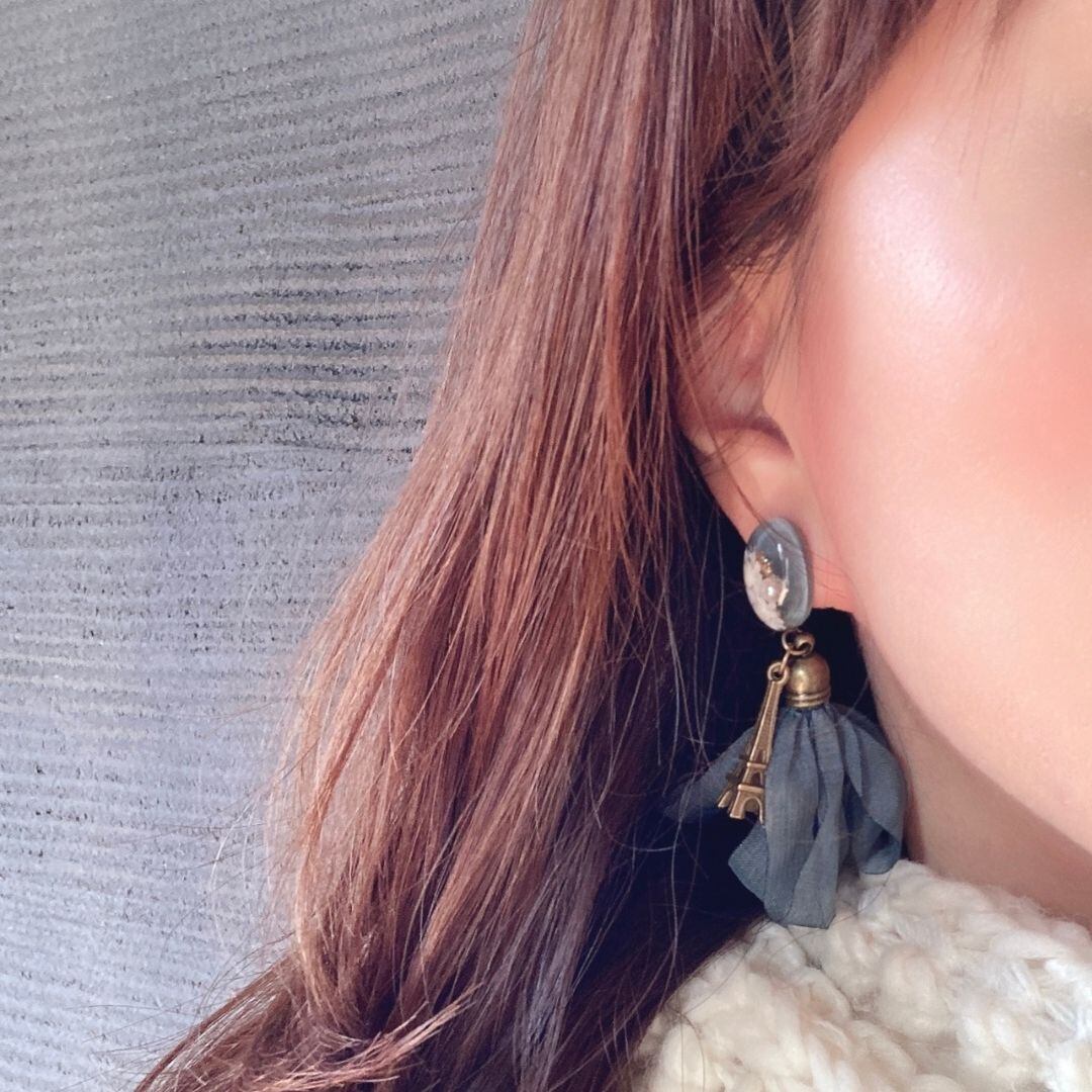 白いスターフラワーを使った透明感あるカボションに、シフォンタッセルと、小さいエッフェル塔を付けました。